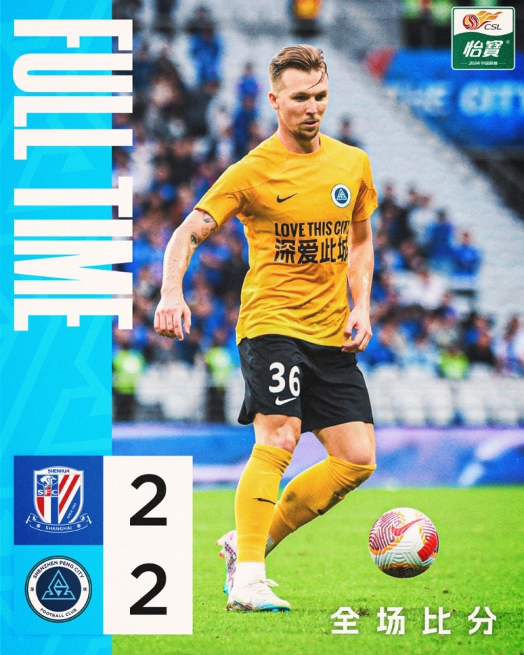 全场比赛结束,上海申花 2-2 深圳新鹏城。
