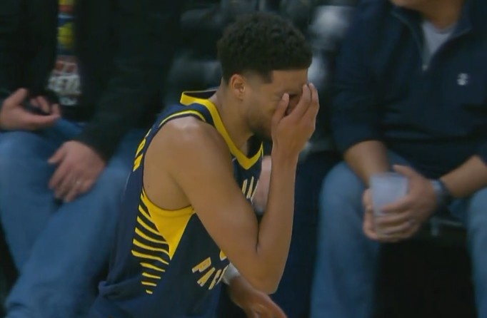 哈利伯顿突破跳起传球被米西防守时手肘蹭到眼角出血下场治疗!
