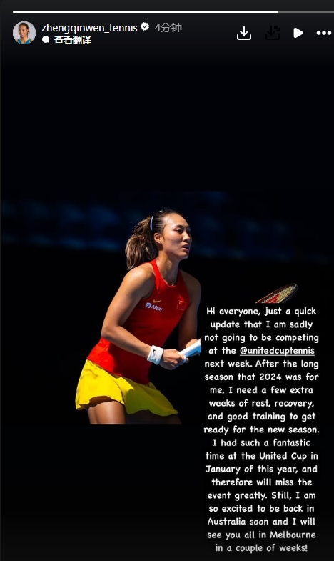 郑钦文:“大家好,我很遗憾下周不会参加联合杯的比赛。在2024年漫长的赛季之后,我需要额外几周的休息、恢复和良好的训练,为新赛季做好准备。