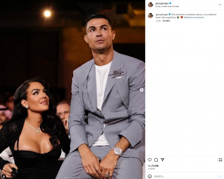 12月28日宣 乔治娜今天在Instagram晒出环球足球奖颁奖典礼的照片,自己一脸崇拜地仰望C罗。