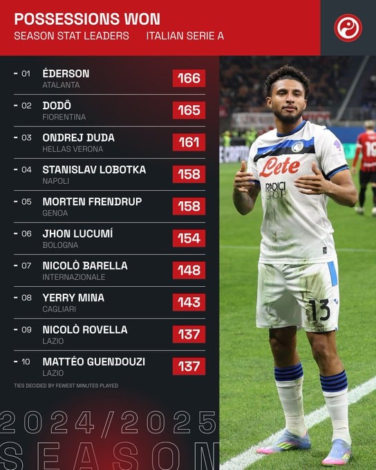 4月23日宣 Squawka统计了本赛季意甲球员联赛夺得球权的次数,并列出榜单,亚特兰大中场埃德森166次居首,多多165次第二。
