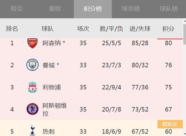 目前阿森纳领先排名第五的热刺20分,曼城也已经领先热刺16分,热刺还剩下5场比赛,已经不可能追上阿森纳和曼城。