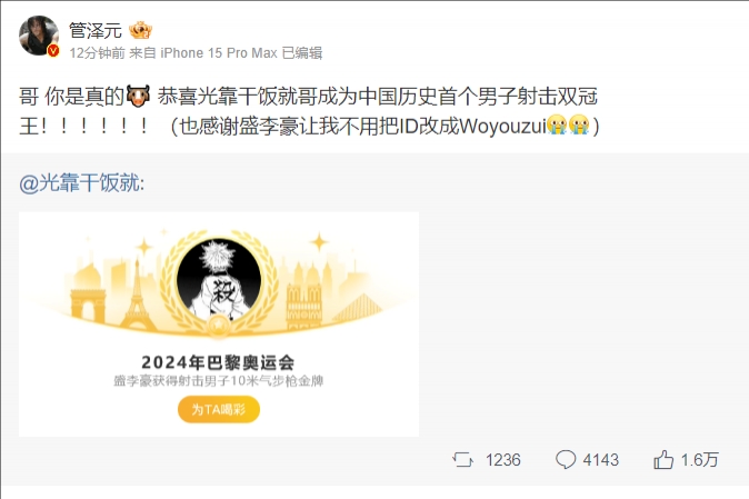 管泽元赞盛李豪:男子射击双冠王!感谢盛李豪让我不用把ID改成我有罪