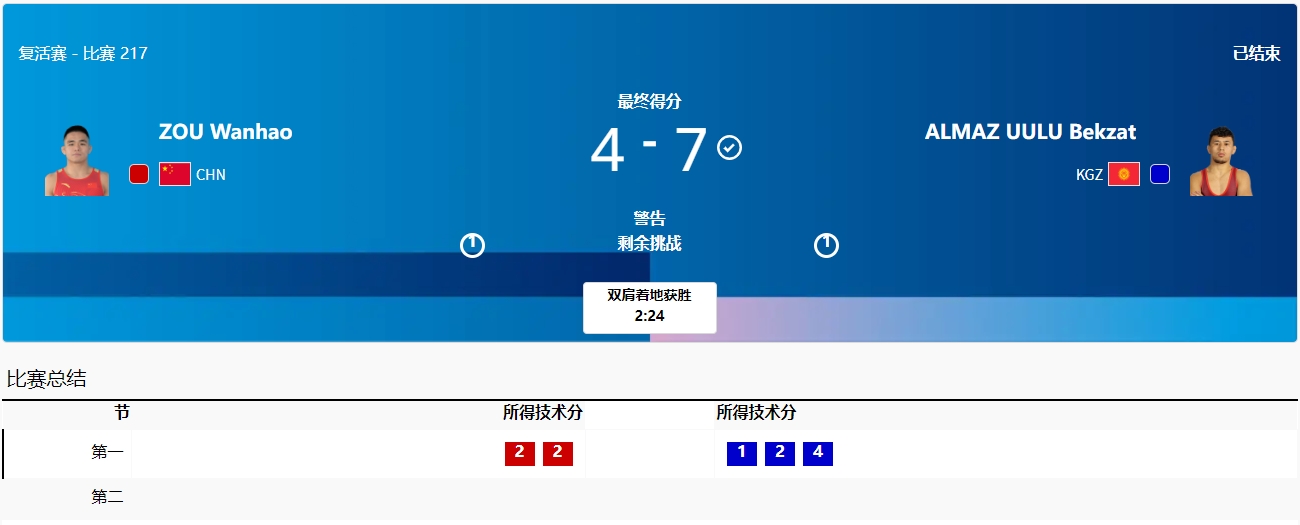 邹万豪一上来就4-0领先,不过随后乌卢连续追分,最终邹万豪因双肩着地直接被判负,无缘铜牌赛。
