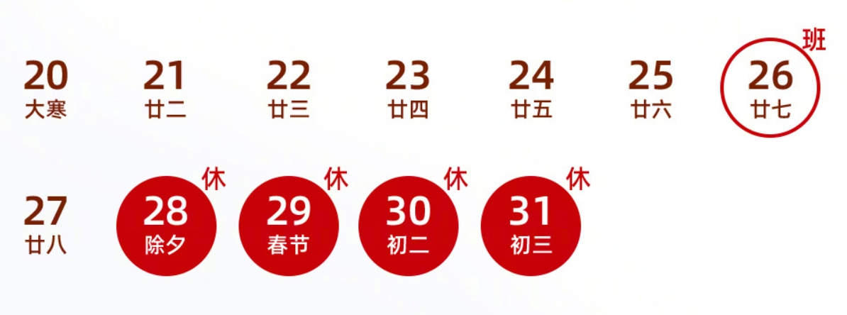 二、春节:1月28日(农历除夕、周二)至2月4日(农历正月初七、周二)放假调休,共8天。1月26日(周日)、2月8日(周六)上班。