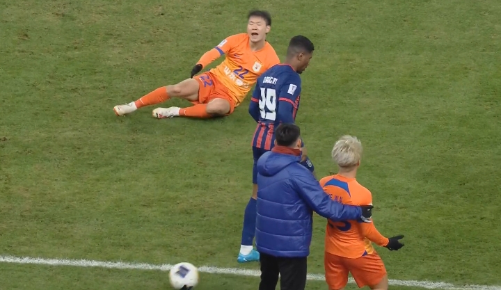 11月26日宣 泰山vs柔佛第27分钟,柔佛球员推倒李源一裁判没吹,再推谢文能,随后双方起冲突。