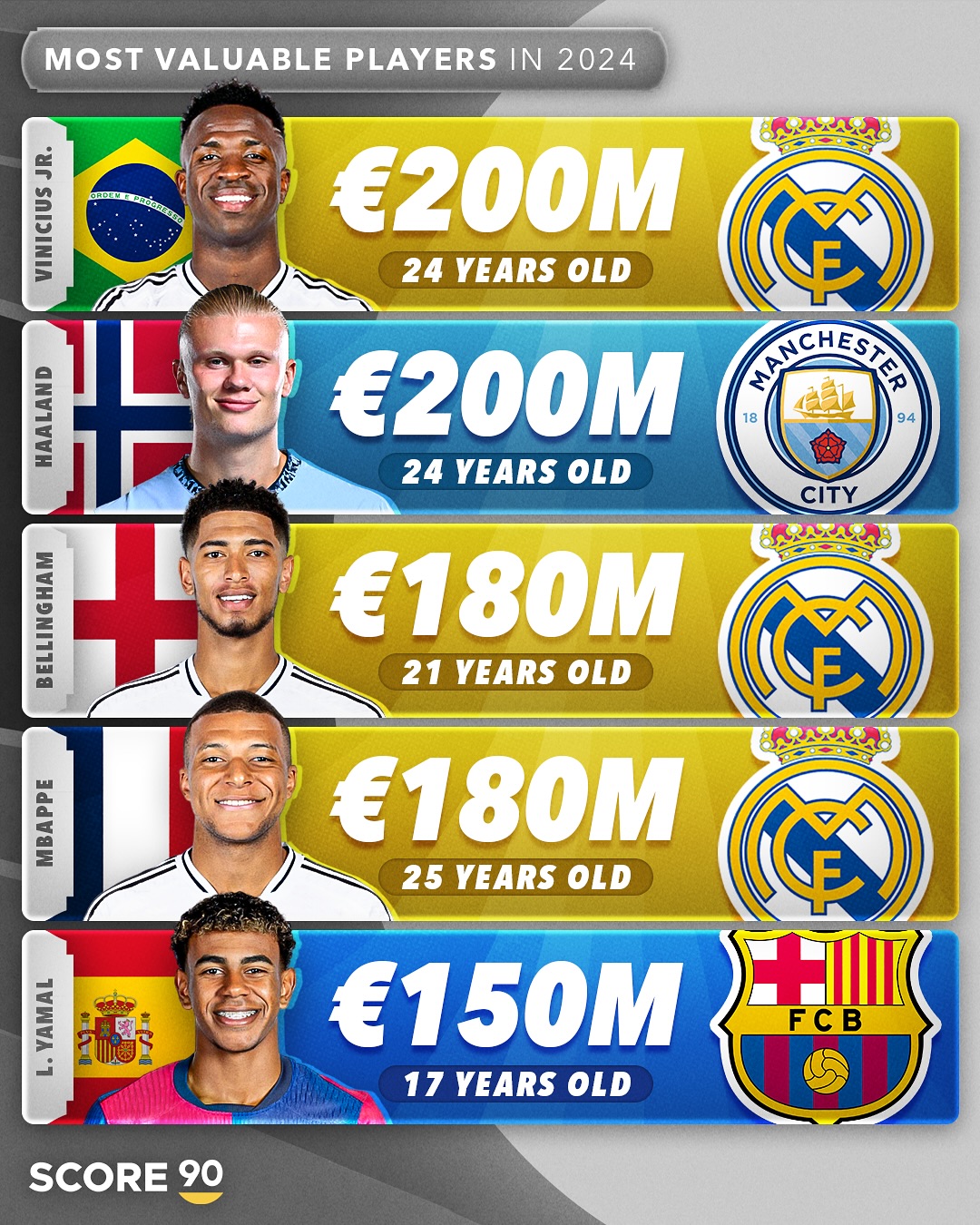 1.维尼修斯(皇马/巴西/24岁)2亿欧