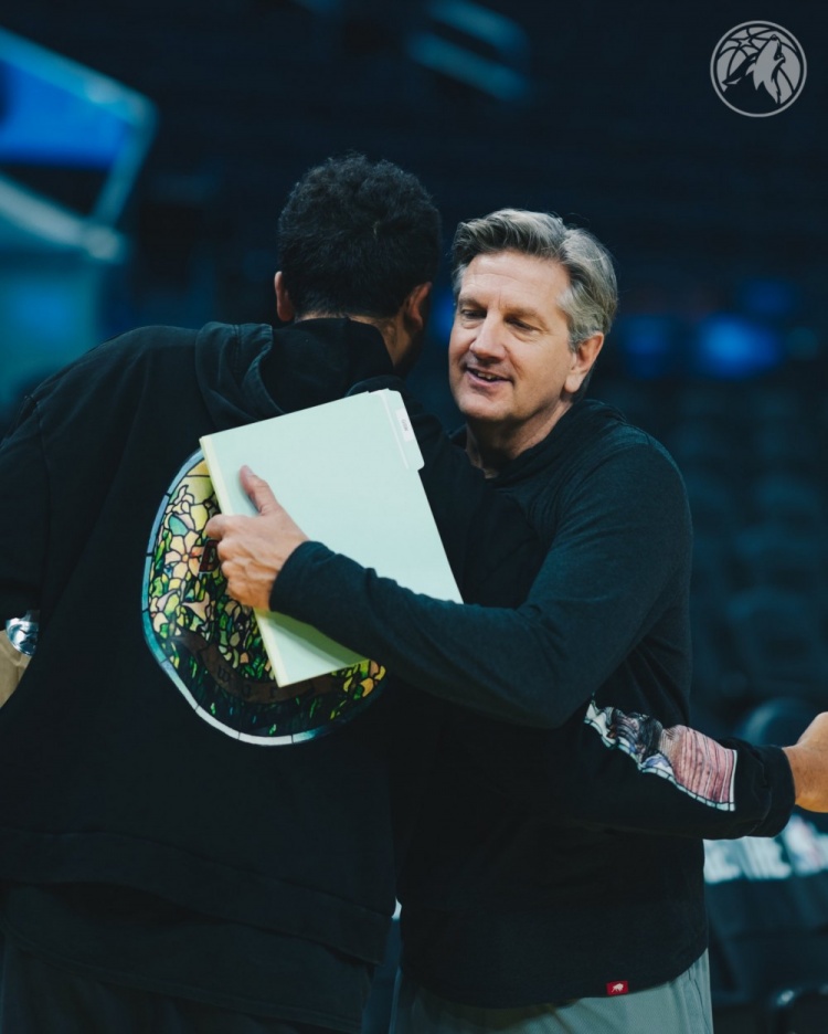 森林狼官方赛前晒出李凯尔与森林狼主帅芬奇,以及戈贝尔、爱德华兹拥抱致意的照片。