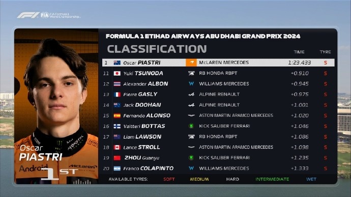 12月7日宣 F1收官战阿布扎比大奖赛结束第三节练习赛争夺,迈凯伦包揽前二,皮亚斯特里第一,诺里斯第二,周冠宇位列第19位。
