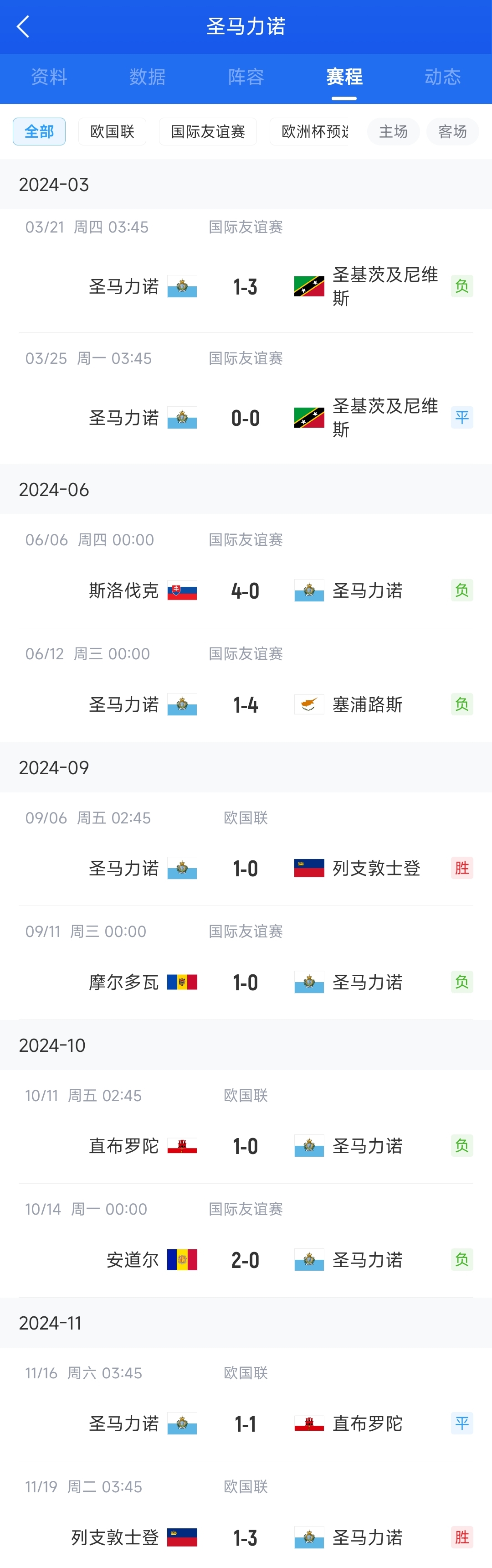 FIFA第210(倒数第1)圣马力诺近10场战绩:2胜2平6负,全队总身价110万欧元