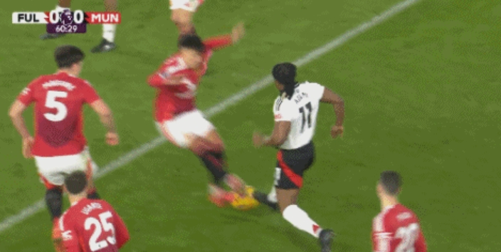 1月27日宣 曼联vs富勒姆第61分钟,特劳雷推进,利桑德罗祭出双脚下跺的危险动作!这下裁判没吹犯规。