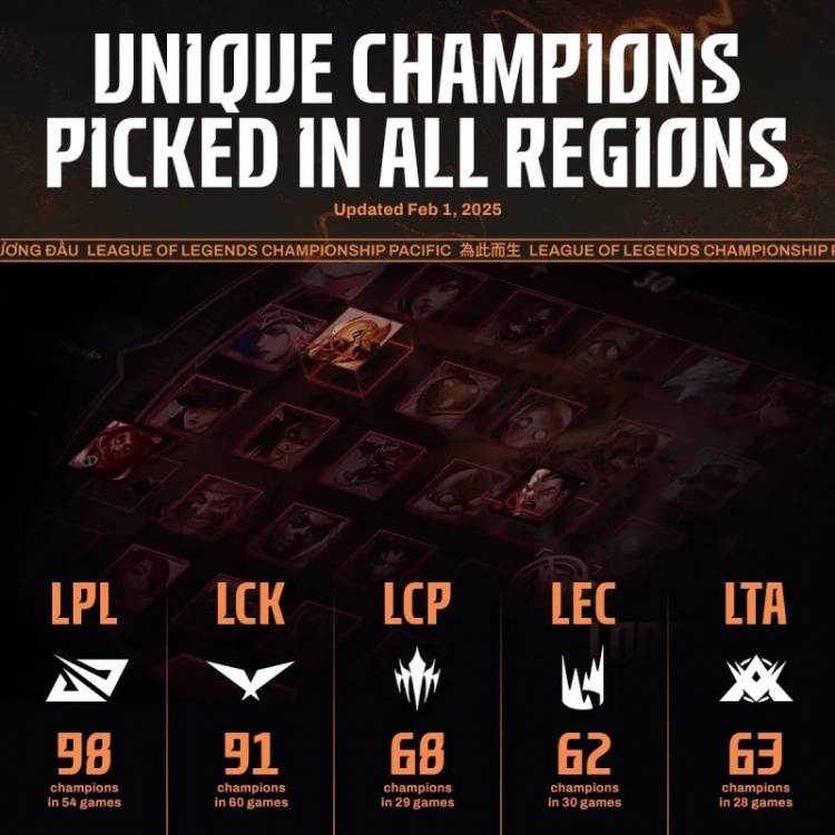 LCP太平洋联赛在29场比赛中有68个不同英雄登场,LEC在30场比赛中有62个不同英雄登场,LTA美洲赛区在28场比赛中有63个不同英雄登场。