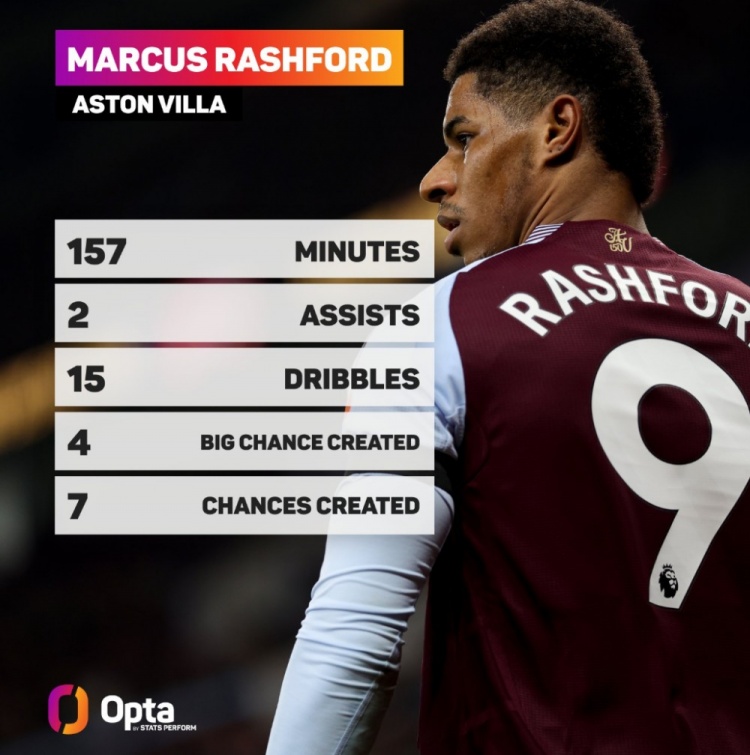 自维拉首秀以来,拉什福德157分钟时间已在英超创造4次绝佳机会