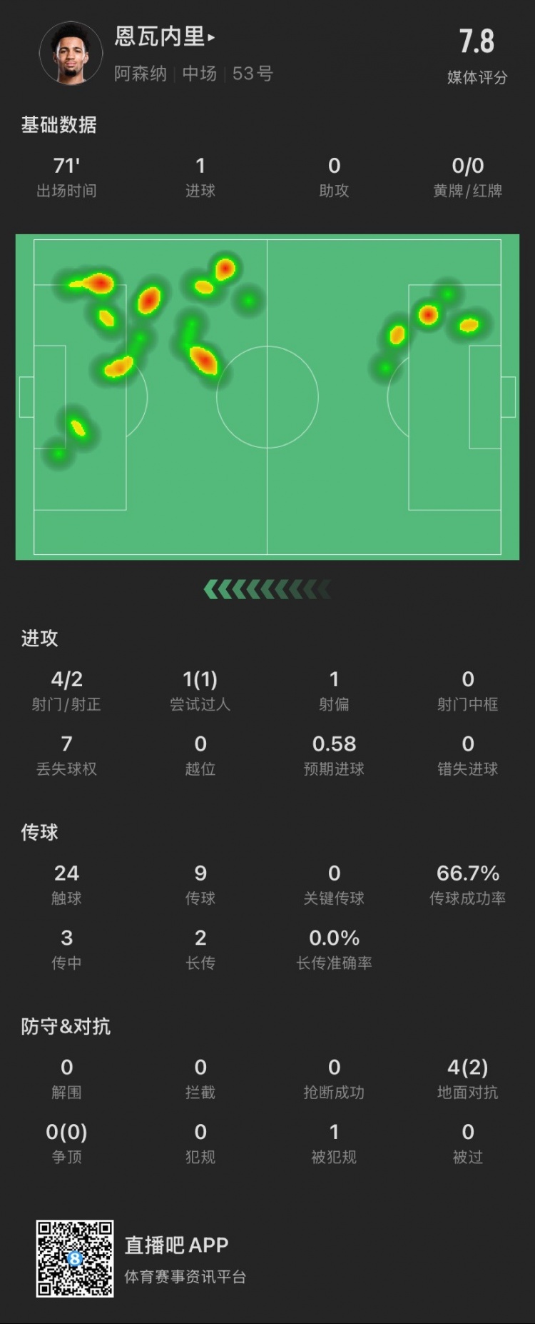 17岁恩瓦内里本场主要数据↓