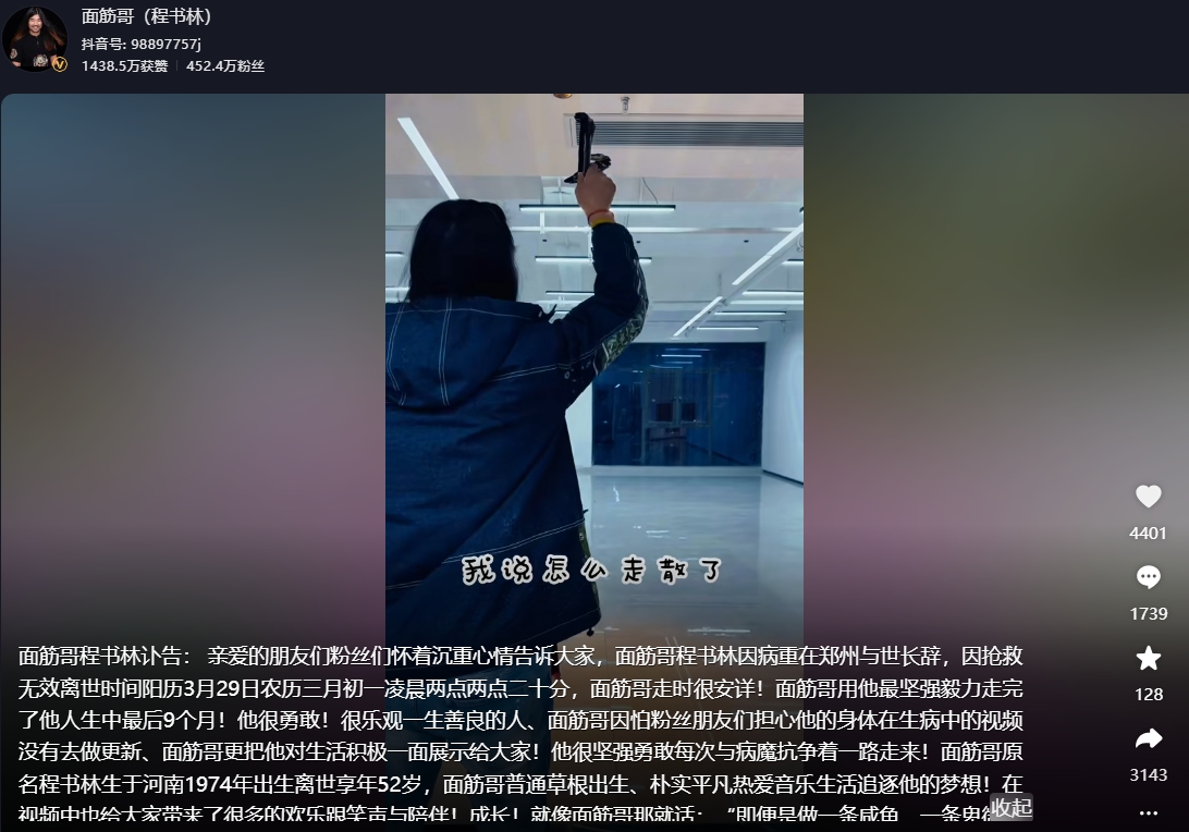 2024年6月27日,程书林发布视频称:26日,“面筋哥”在家晕倒;27日,被送进ICU病房,医生告知是肝癌晚期,已下病危通知。