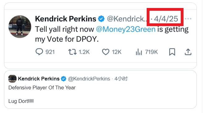 有趣的是,就在11天前帕金斯还发推称追梦赢得了他的DPOY投票。