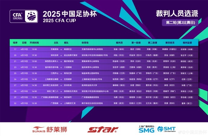 4月19日宣 中国足协杯官方公布第二轮第2比赛日裁判安排,张超执法无锡吴钩vs南通支云,郭翔执法深圳二零二八vs陕西联合,马腾执法广州蒲公英vs南京城市。