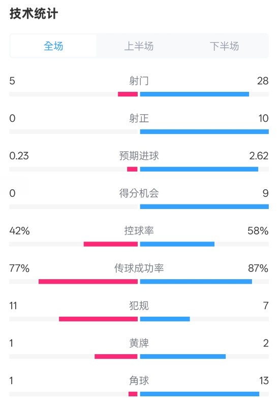 莱斯特城01利物浦全场数据:射门528,射正010,控球率42%58%