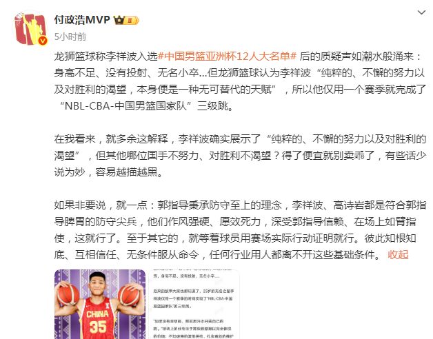 至于评论区该媒体人的带节奏阴阳郭士强等,也是完全没必要。中国男篮本届亚洲杯的最终成绩,并不会因为有无李祥波有太多变化,也不会因为换掉李祥波或怎么样出现大变化,毕竟决定上限与下限的会是其他更重要的球员,而年轻球员的拼搏努力不应该被无视。