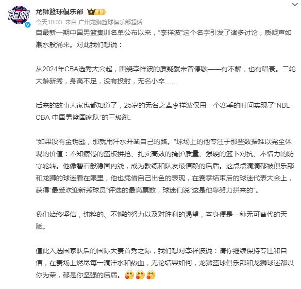 广州男篮官方给自己的球员发声回应质疑:“从2024年CBA选秀大会起,围绕李祥波的质疑就未曾停歇——有不解,也有唱衰。二轮大龄新秀,身高不足,没有投射,无名小卒……后来的故事大家也都知道了,25岁的无名之辈李祥波仅用一个赛季的时间实现了‘NBL-CBA-中国男篮国家队’的三级跳。”