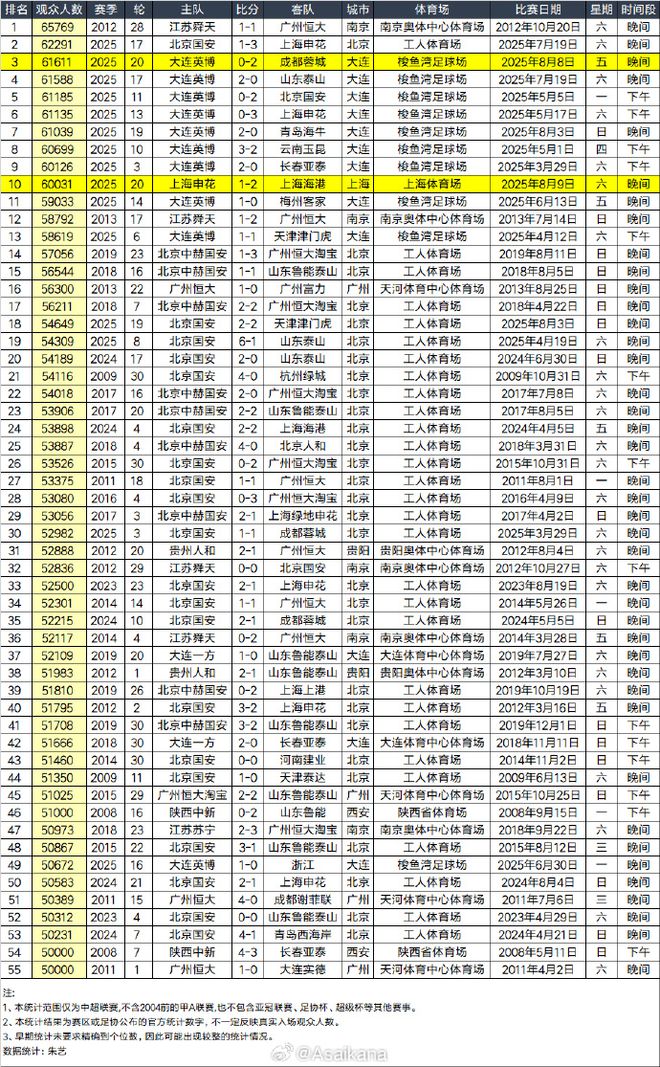 本轮两场中超观赛人数冲进top10,英博61611人位列第3