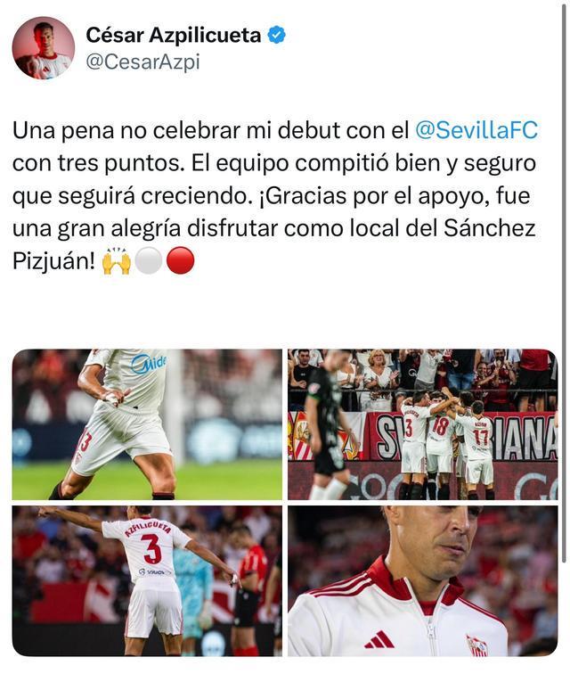 北京时间9月13日,西甲第4轮比赛,塞维利亚主场2-2战平埃尔切。赛后,夏窗加盟塞维利亚的阿斯皮利奎塔社媒回顾了自己的塞维利亚首秀。