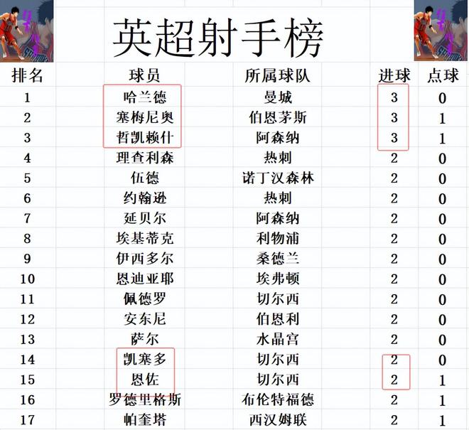射手榜方面,哈兰德,塞梅尼奥,哲凯赖什3球并列第一,凯塞多今天打入一球后,追上伍德,埃基蒂克,恩佐等人,2球刚好挤入前十。