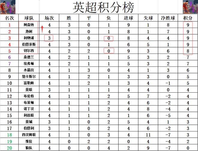 积分榜方面,阿森纳和热刺今天都赢了球,他们都是3胜1负,先赛的情况下,以净胜球优势齐齐超过利物浦,阿森纳拿到榜首体验卡,利物浦跌到第3。同样是3胜1平的伯恩茅斯排在第4,切尔西最后时候被绝平无缘3连胜,2胜2平保持不败的他们排在第5。