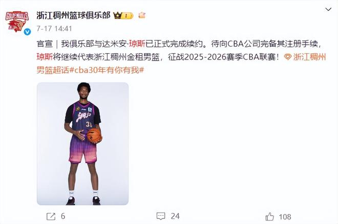 达米安-琼斯上个赛季也在浙江打球,身高2米13的内线,常规赛场均30.5分钟,得到17.7分9.1篮板3.3助攻,季后赛表现很差,与青岛的系列赛,第一场只有7分,第三场只有2分。本以为稠州俱乐部不会续约琼斯,但还是续约了。