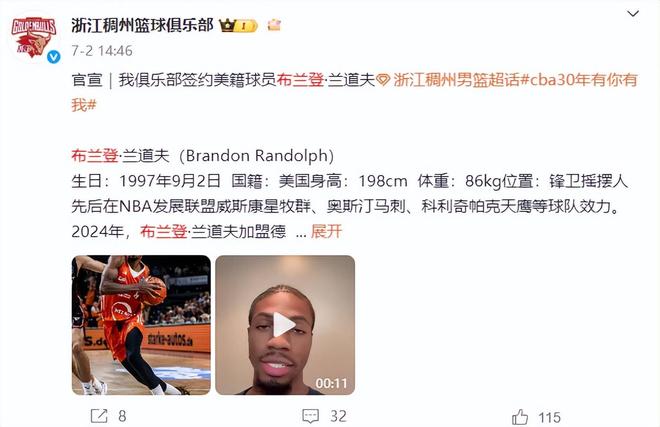 新来的外援布兰登-兰道夫,身高1米98,锋卫摇摆人,28岁,曾经在NBA发展联盟打球,上赛季效力于德甲联赛,是德甲联赛得分王,应该很厉害。