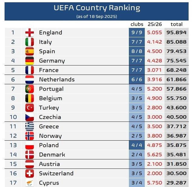 直播吧9月19日宣 欧冠联赛阶段首轮已经完赛,相关机构也统计了本赛季的欧战积分情况,并更新了欧足联旗下各协会的积分排名。英格兰依然独自领跑,而意大利第二的位置仍暂时牢固,但领先优势有略微缩小。