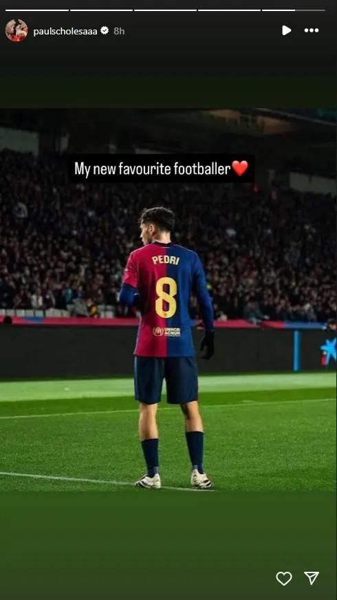 赛后,斯科尔斯在社媒晒出佩德里的照片,并配文:“我的新晋最爱球员”