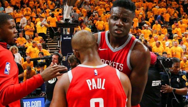 2017年夏天,克里斯·保罗加盟火箭,这支球队瞬间成为夺冠大热门,而卡佩拉也在保罗和哈登的身边,迎来了职业生涯的巅峰。保罗的传球精准如手术刀,哈登的突破极具杀伤力,卡佩拉则成了两人最完美的“搭档”——他的挡拆顺下速度极快,总能在对手补防前冲到篮下;他的空接终结能力堪称顶级,无论传球多高多远,他都能跳起来稳稳接住,然后暴力扣篮得分。那段时间,火箭的“挡拆空接”战术成了联盟其他球队的噩梦,卡佩拉也因此获得了“饼皇”的称号。2018-19赛季,他场均能得到16.6分、12.7个篮板、1.5个盖帽,投篮命中率高达64.8%,不仅入选了NBA最佳防守第二阵容,还帮助火箭打出了65胜17负的联盟第一战绩,一路杀进西部决赛。