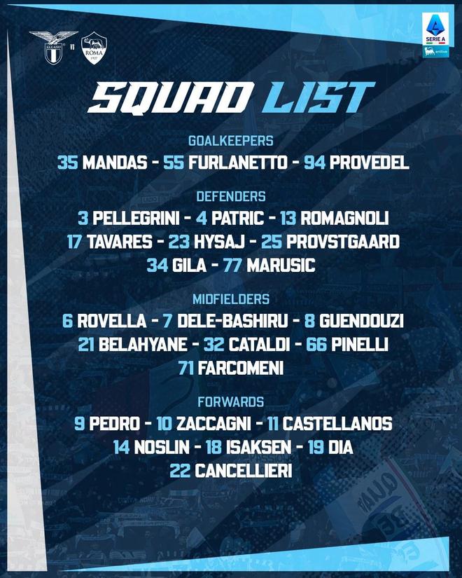 拉齐奥罗马德比大名单:佩德罗、扎卡尼领衔,帕特里克回归