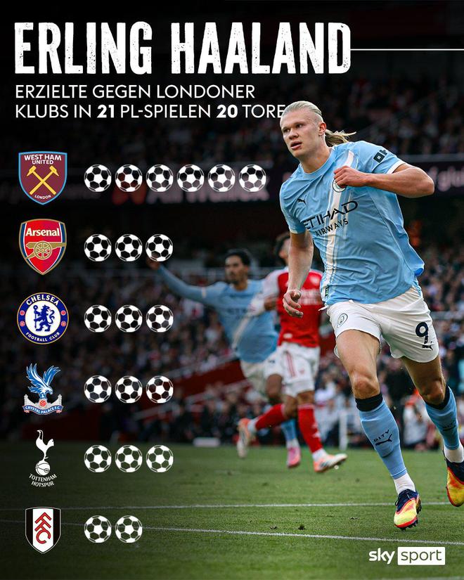 恐怖!哈兰德在英超对阵伦敦球队的21场比赛中共打进20球