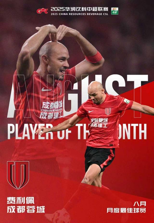 两场梅开二度,官方:蓉城前锋费利佩当选中超联赛8月最佳球员