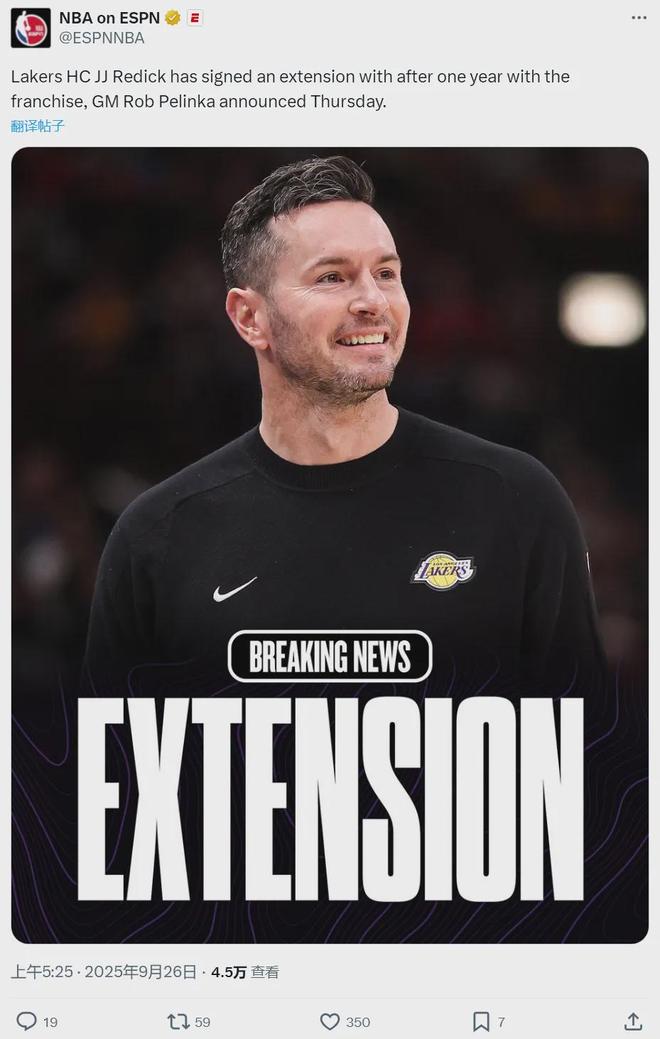 “湖人希望通过续约雷迪克主教练来传递管理层的立场。我们认为雷迪克是一位拥有独特执教理念的杰出主教练,他的思想体系将推动湖人去塑造一个卓越的球队文化。”
