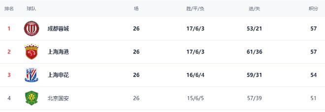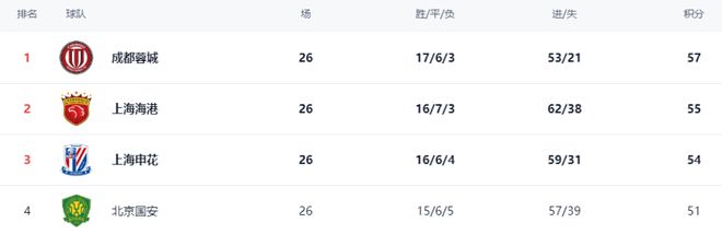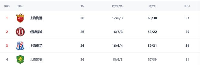 最终,海港在26轮之后以57分排名榜首,成都蓉城以55分排名次席,申花、国安分别排名第3、4位。