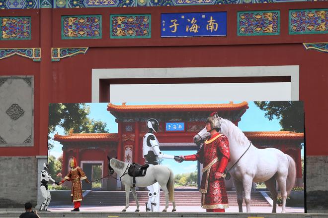 伴随着开场视频里的马鸣声,一个身穿古代服饰的“狩猎者”骑着马来到了会场,并随后与人形机器人“天工”握手。这传统与现代极具反差的一幕,吸引了不少学生和家长。