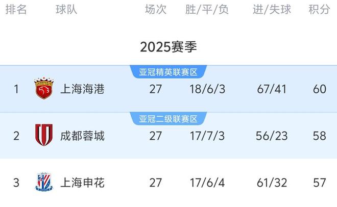 最新积分榜方面,由于争冠3队本轮取得全胜,前3的排名没有发生变化。上海海港成为首支突破60分的球队,继续以2分的优势领跑。成都蓉城积58分排在第2,上海申花则积57分位列第3。