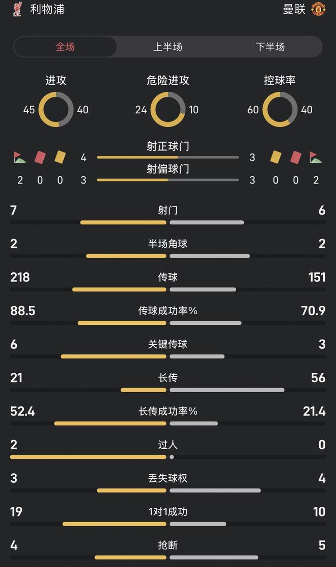 双红会半场数据对比:双方射门接近,利物浦场面略占优