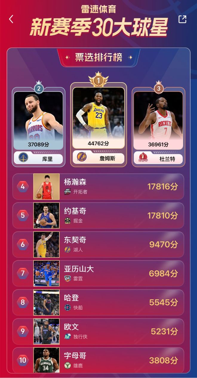 目前雷速NBA新赛季30大球星排名结果如下: