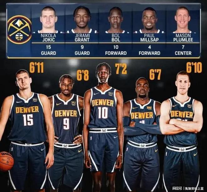 原本以为2019-20赛季丹佛掘金在泡泡园区曾派出的首发五虎:尼古拉约基奇(2.11米)+杰拉米格兰特(2.01米)+波尔波尔(2.21米)+梅森普拉姆利(2.13米)+保罗尔萨普(2.01米)的平均身高已经天下无敌了!可谁曾想到,五年后的NBA竟然会有比丹佛掘金首发五虎平均身高还要更为炸裂的首发阵容诞生。
