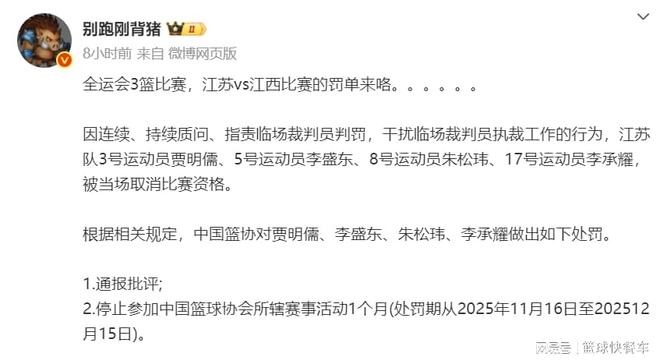 据悉,这一次处罚时间为2025年11月16日,到2025年12月15日,在这一个月内,朱松玮、贾明儒等4人都将被禁赛。而根据CBA新赛季的安排,CBA季中赛第一阶段的比赛,将会被安排在12月3日开打,而CBA新赛季揭幕战则安排在12月12日。换句话说,CBA季中赛和揭幕战,朱松玮和贾明儒等人是打不了了。对于他们和他们所在的俱乐部而言,确实是一个不小的打击。