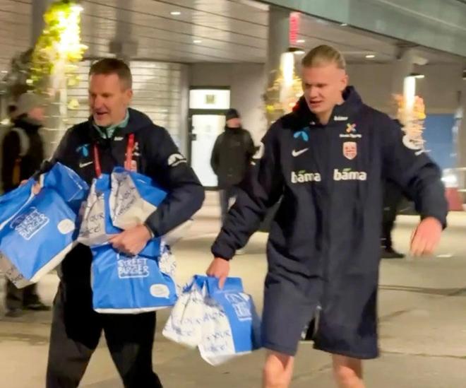 在战胜爱沙尼亚后,哈兰德和挪威队工作人员被拍到提着汉堡往更衣室赶。据悉,食物是由名为“88街汉堡”的汉堡店送来的,订单是一份经典的汉堡配薯条。