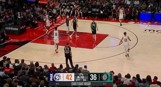 第三节开拓者卡马拉拿下6分,太阳伊戈达罗拿下8分,第三节结束开拓者82-100落后太阳