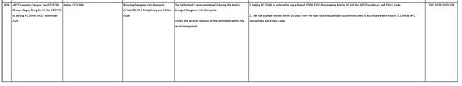 亚足联官方表示,北京国安与河内公安的行为损害了赛事声誉。(此为双方在累犯期内的第二次违规)北京国安足球俱乐部(中国)、河内公安足球俱乐部(越南) 因违反《亚足联纪律与道德准则》第50.1条,被处以6250美元罚款。