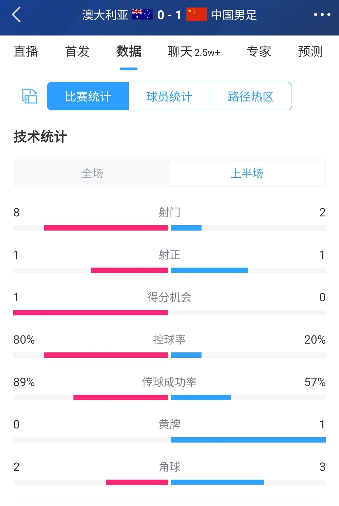 国足半场11澳大利亚数据:国足控球率2成,双方均1脚射正即进球