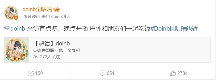 直播间集合!Doinb赛后更博:采访有点多,晚点开播!户外和朋友们一起吃饭